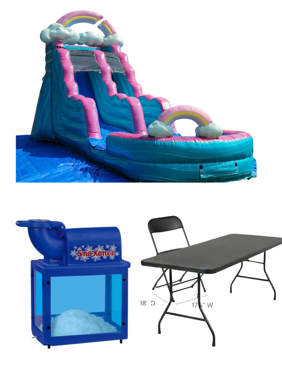 Make a splash with the 15ft I'mperfectly Package — a lively waterslide rental perfect for backyard parties, summer gatherings, and any event that needs big fun. This package centers on a 15-foot waterslide that delivers thrilling slides and gentle landings, plus party-ready extras: a 6-foot table and chairs for guests to gather, and a Snow Kone machine to serve cold, colorful treats. Designed for easy setup at parks, yards, or community spaces, the package gives hosts everything they need for a fun, family-friendly experience without the fuss of sourcing separate items. Ideal for birthdays, neighborhood block parties, or just beating the heat, the 15ft I'mperfectly Package turns an ordinary day into an unforgettable celebration.